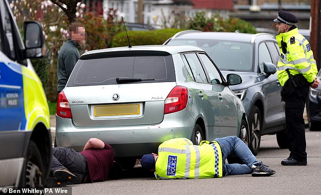 Police check the engine and undercarriage of a silver-coloured Skoda in a road in Finchley last Friday