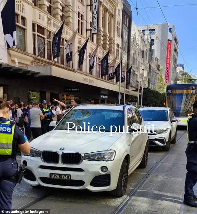 The SUV – with smashed windows – was surrounded by cops about 1.30pm on Monday as its occupants reportedly fled through the nearby Myer department store.