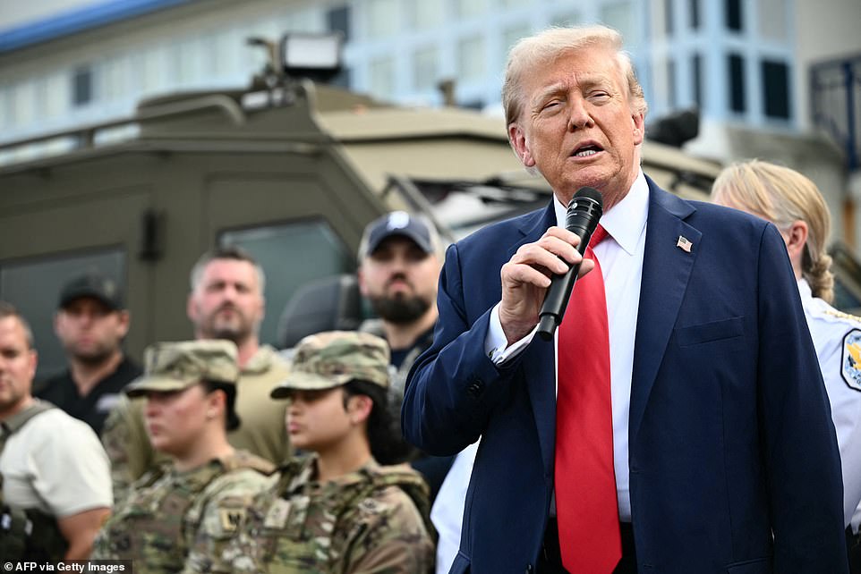 After he’s finished beautifying the city, and specifically the grass, the president claims it will look like Trump National Golf Club. ‘It’s going to go up like a miracle,’ he claimed. You do the job and safety and I’ll get this place fixed up physically and we’re going to be so proud of it at the end of six months. But let’s say at the end of a year, this place will be maxed out in terms of beauty.’ The president said earlier in the day that he would j oin a ‘patrol’ with military and law enforcement to survey the progress after he initiated a federal crime crackdown in the city. But in a far cry from riding alongside officers in the dark of night through DC’s most dangerous neighborhoods, the president played it safe, staking out a police headquarters in Anacostia hours before sunset. ‘It’s like a different place, it’s a different city,’ Trump touted, insisting: ‘Everybody’s safe now.’