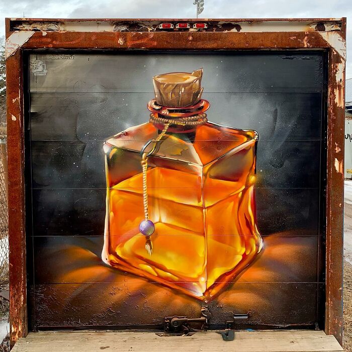 Description: “The Blue Elixir Bottle. Painted on a sunny day in Portland Maine! These mini-murals are a great way for me to push my skills in lighting, shadows, reflections, transparent materials and more.”