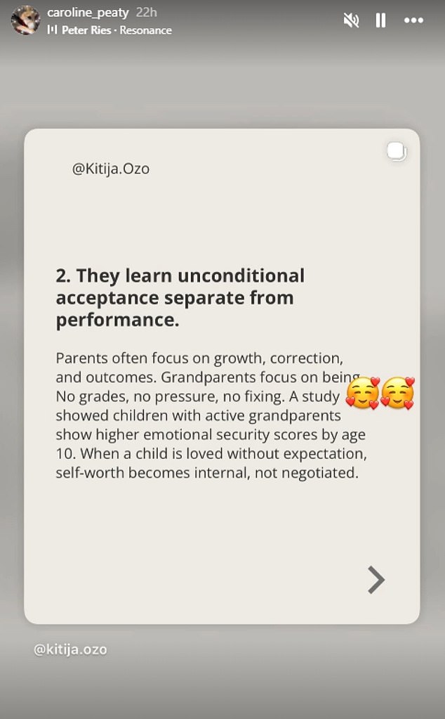 Following the show’s release, Caroline has taken to social media to share a post which said: ‘Parents often focus on growth, correction and outcomes. Grandparents focus on being.
