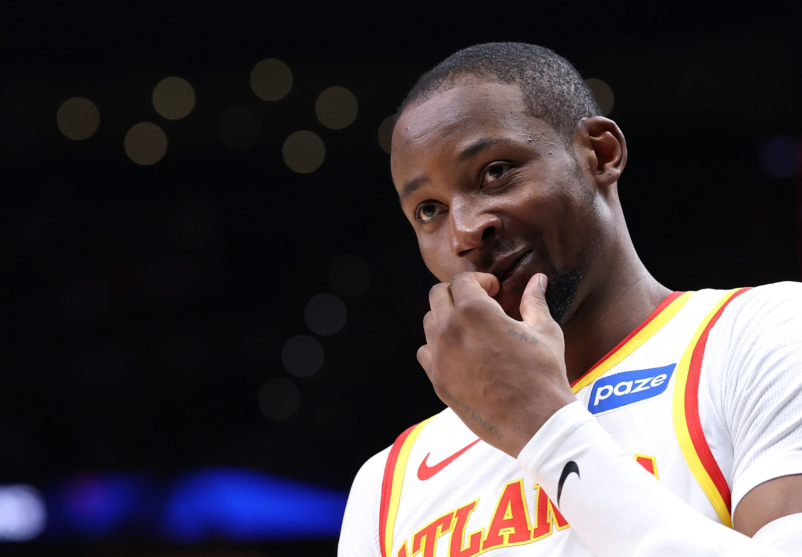 ATLANTA, GEORGIA – MARCH 01: Jonathan Kuminga #0 of the Atlanta Hawks reacts against the Portland Trail Blazers during the third quarter at State Farm Arena on March 01, 2026 in Atlanta, Georgia. NOTE TO USER: User expressly acknowledges and agrees that, by downloading and or using this photograph, User is consenting to the terms and conditions of the Getty Images License Agreement. (Photo by Kevin C. Cox/Getty Images)