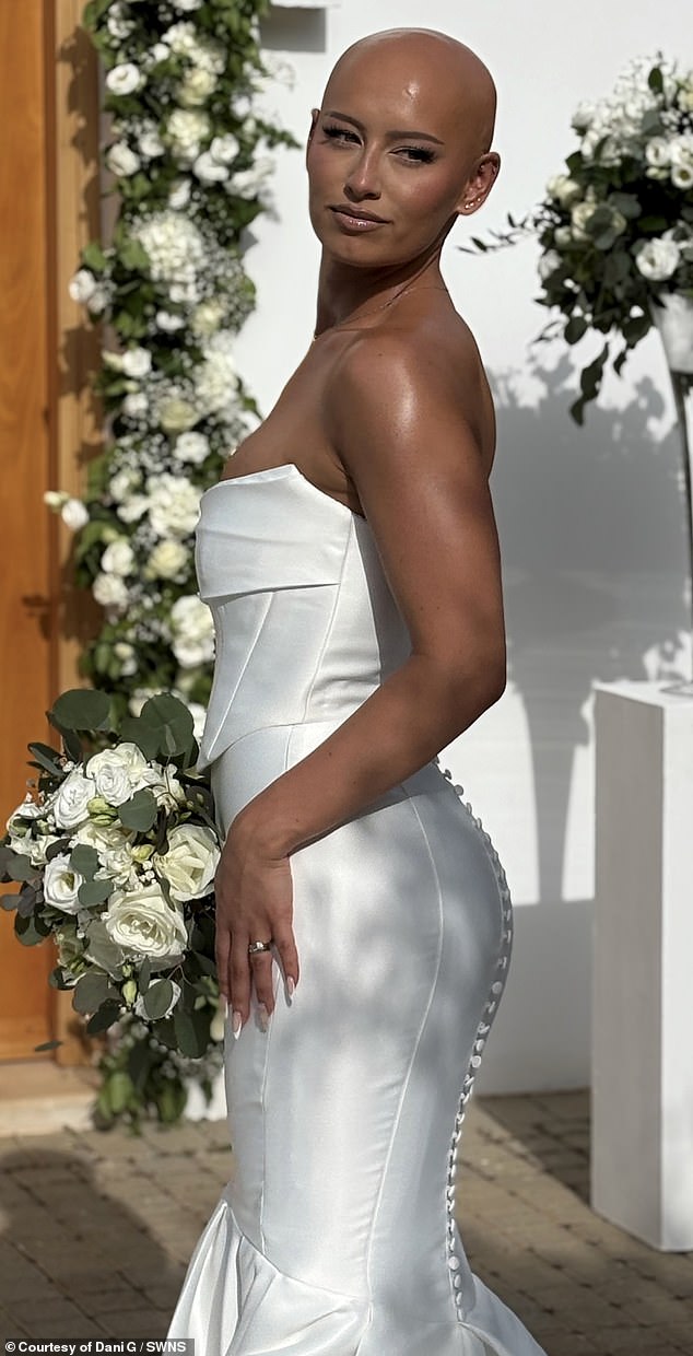 Dani G, 27, from Newcastle upon Tyne, ditched her wig to walk down the aisle – after her husband said he would love to marry her how he ‘fell in love’ with her