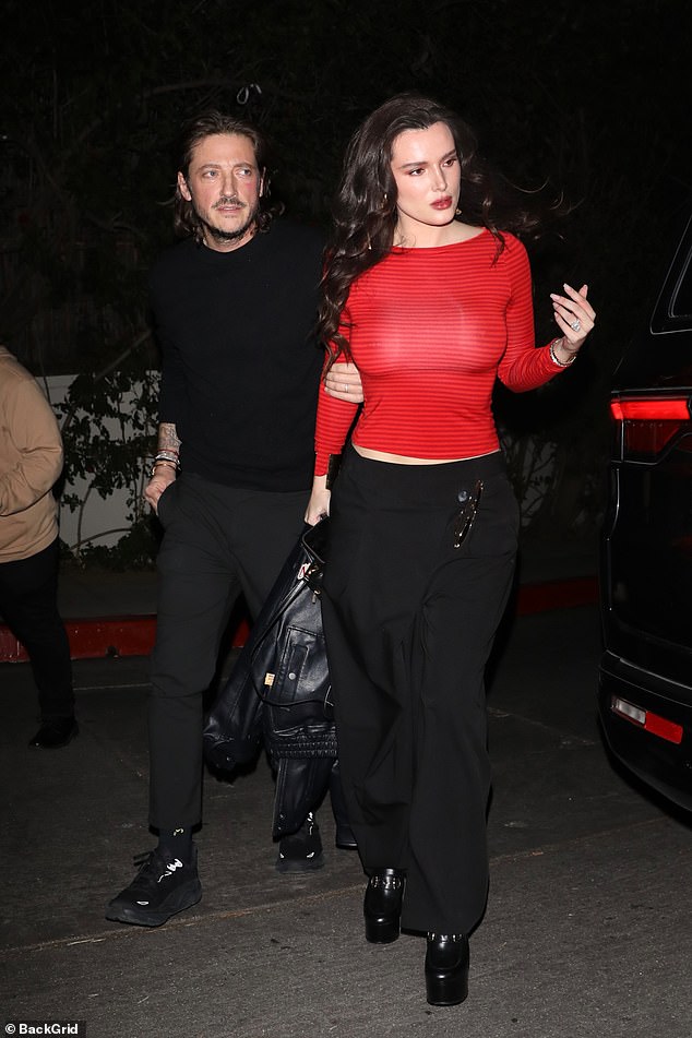 Bella Thorne made a bold fashion statement on Sunday night as she arrived at a Grammys after-party in Hollywood, stepping out bra-free beneath a sheer, ribbed red top