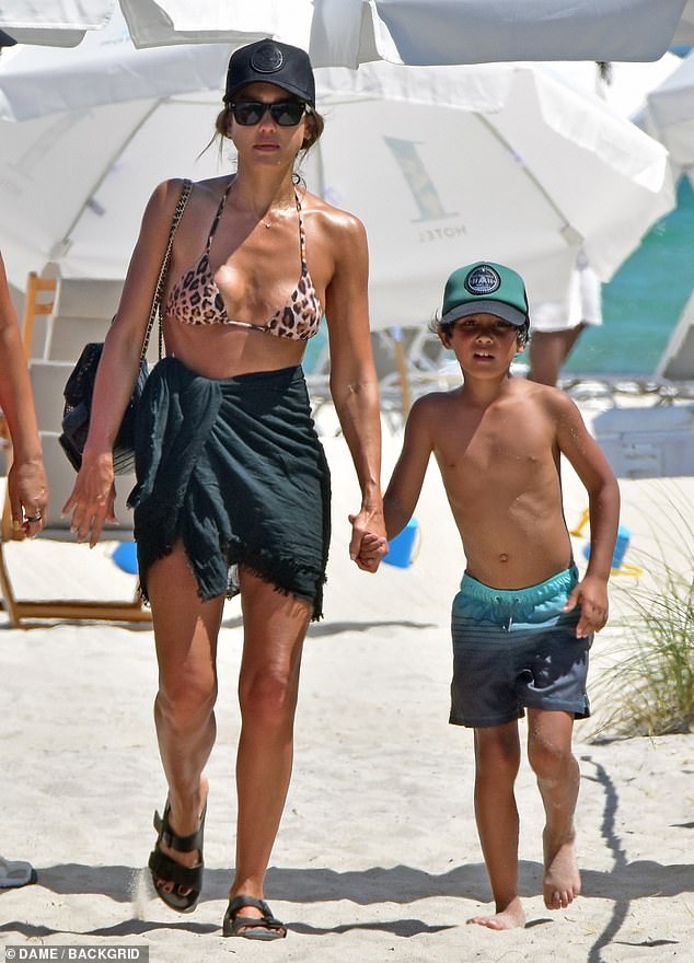 The gorgeous mother of three — who filed for divorce from her longtime husband Cash Warren earlier this year after 16 years of marriage — hit the beach with seven-year-old son Hayes as they walked hand-in-hand on the sand.