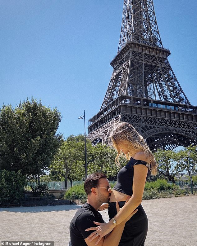 Posting a touching photo of the couple beside the Eiffel Tower in Paris, Michael can be seen kneeling as he plants a kiss on Nicole’s bare baby bump.