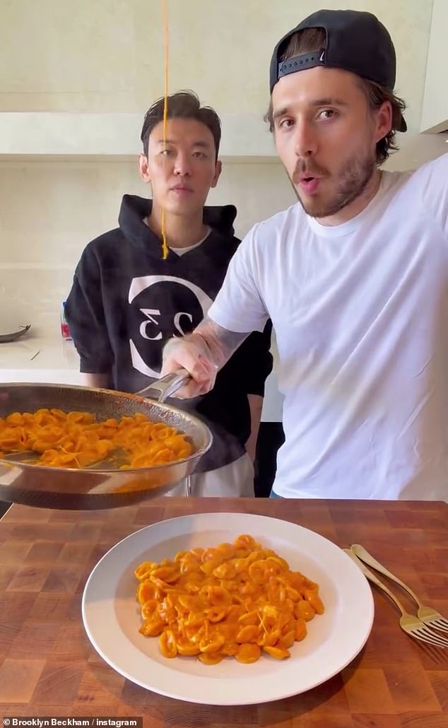 Brooklyn Beckham was back in the kitchen on Wednesday as he whipped up a pasta dish for a visiting pal.
