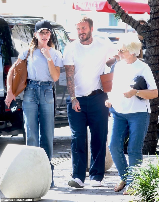 David and Victoria Beckham enjoyed an alfresco lunch with his mother Sandra and father Ted in Miami on Sunday as a row with their neighbours rages on back in the UK.