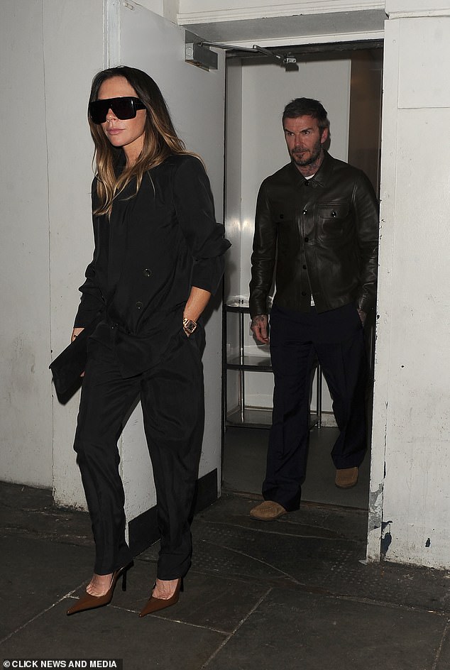 Victoria opted for an all black look for the evening while David sported a dark leather jacket and tan shoes