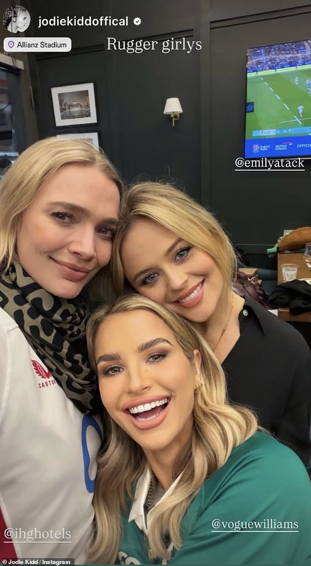 Emily Atack looked in high spirits as she joined Vogue Williams, her husband Spencer Matthews and Jodie Kidd at the Six Nations Championship at Twickenham Stadium on Saturday.