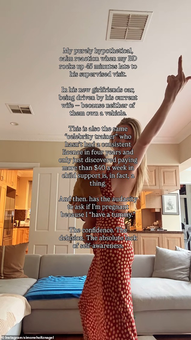 ‘My purely hypothetical, calm reaction when my BD [baby daddy] rocks up 45 minutes late to his supervised visit,’ Simone wrote over the top of the clip