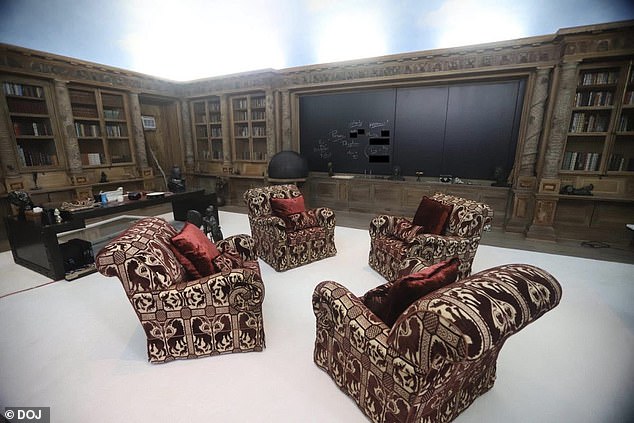 One of the living room and offices located on Jeffrey Epstein’s private island is decorated with gaudy armchairs and wooden bookshelves