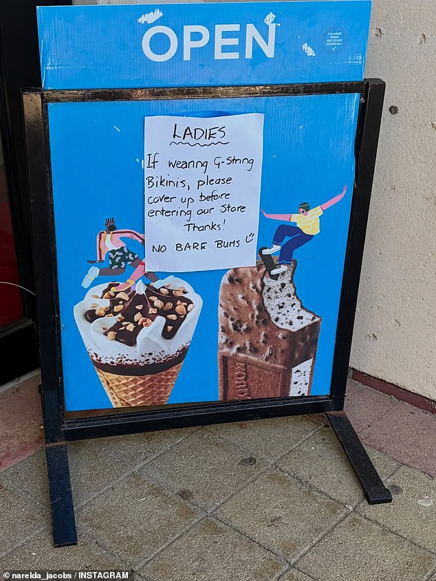 ‘Ladies. If wearing G-string bikinis, please cover up before entering our store. Thanks,’ the sign outside the store read.