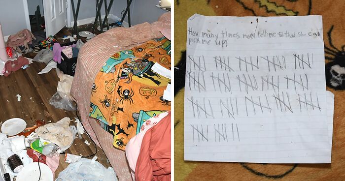 The note read “How many times mom tells me that she can’t pick me up!” with 87 dash marks filling the page. The letter was collected as evidence.