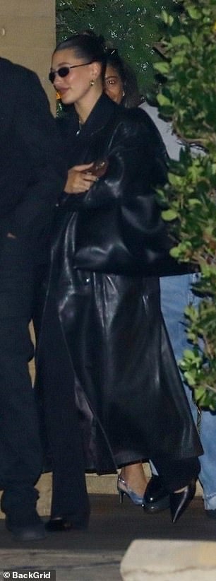 Hailey showed off her impeccable sense of style in a long black leather coat, and toted a black bag over her shoulder