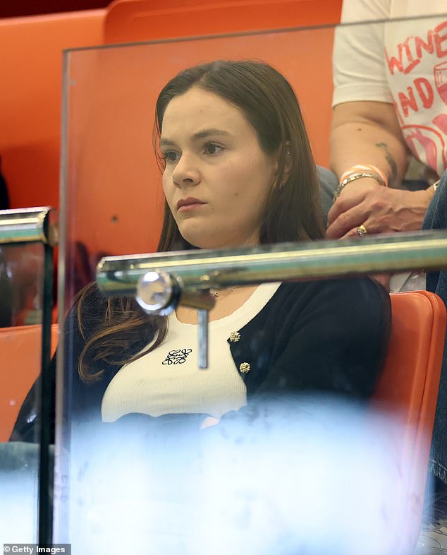 Sitting in the stands, Holly wore a black cardigan over a white Loewe tank top while watching the race unfold.