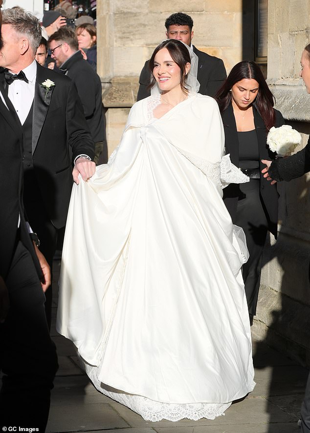 Holly swept into her wedding in Bath Abbey on the arm of her celebrity chef father, but kept her lace gown concealed beneath a billowing hooded ivory cloak.