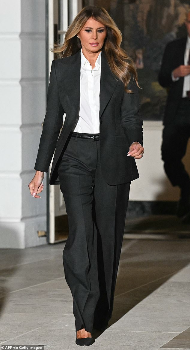 Melania emulated business chic in a dark gray Dolce & Gabbana pantsuit with flared trousers, an ensemble that she paired with a white button-down shirt and black Manolo Blahnik heels.
