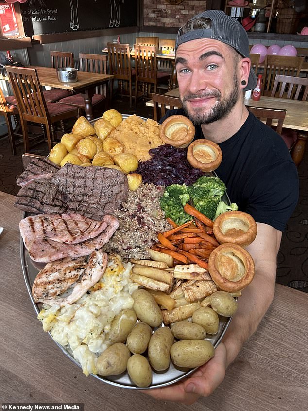 Joel Hansen, from Toronto, Ontario, jetted more than 3,000 miles to take on a 6,000-calorie British Sunday roast challenge