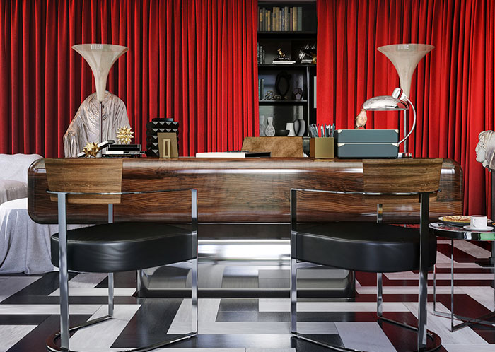 The pop-art element is still there, but Almodovar’s looks both swarthy and slick, raw, and pushed to the excesses of sophistication. The interior design in his latest, Pain and Glory, demonstrates the filmmaker’s over-the-top philosophy: if every element sticks out, no element sticks out. For our Almodovarian home office, that means the unifying principle is “anything goes”—as long as it’s fabulous.”