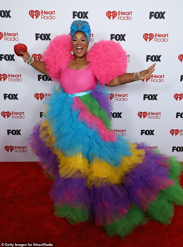 Singer Cheryl Porter, 53, made a very bold entrance in a rainbow-colored gown that boasted bright pink puff-ball shoulders and a tiered tulle skirt that flowed down into a dramatic train