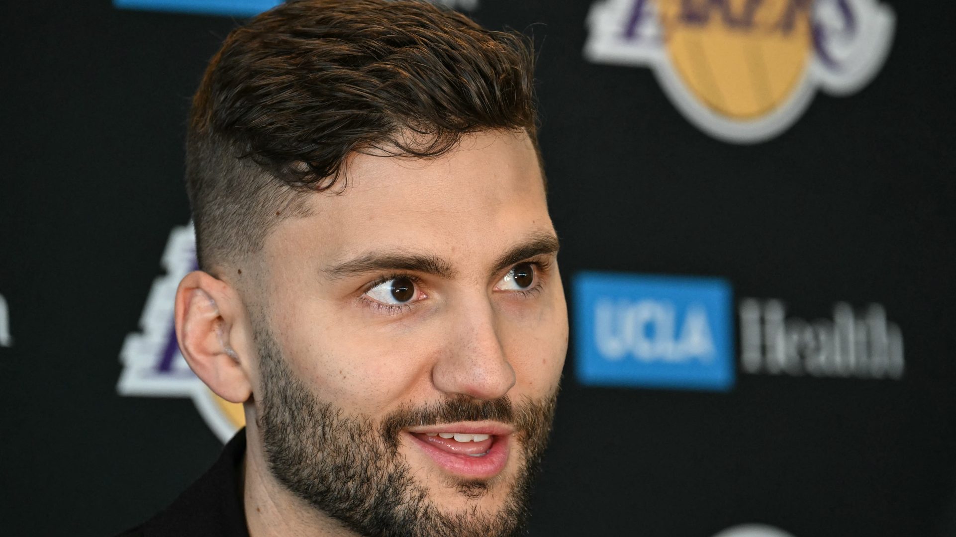 German basketball player Maxi Kleber speaks during a press conference to introduce new members of the Los Angeles Lakers.
