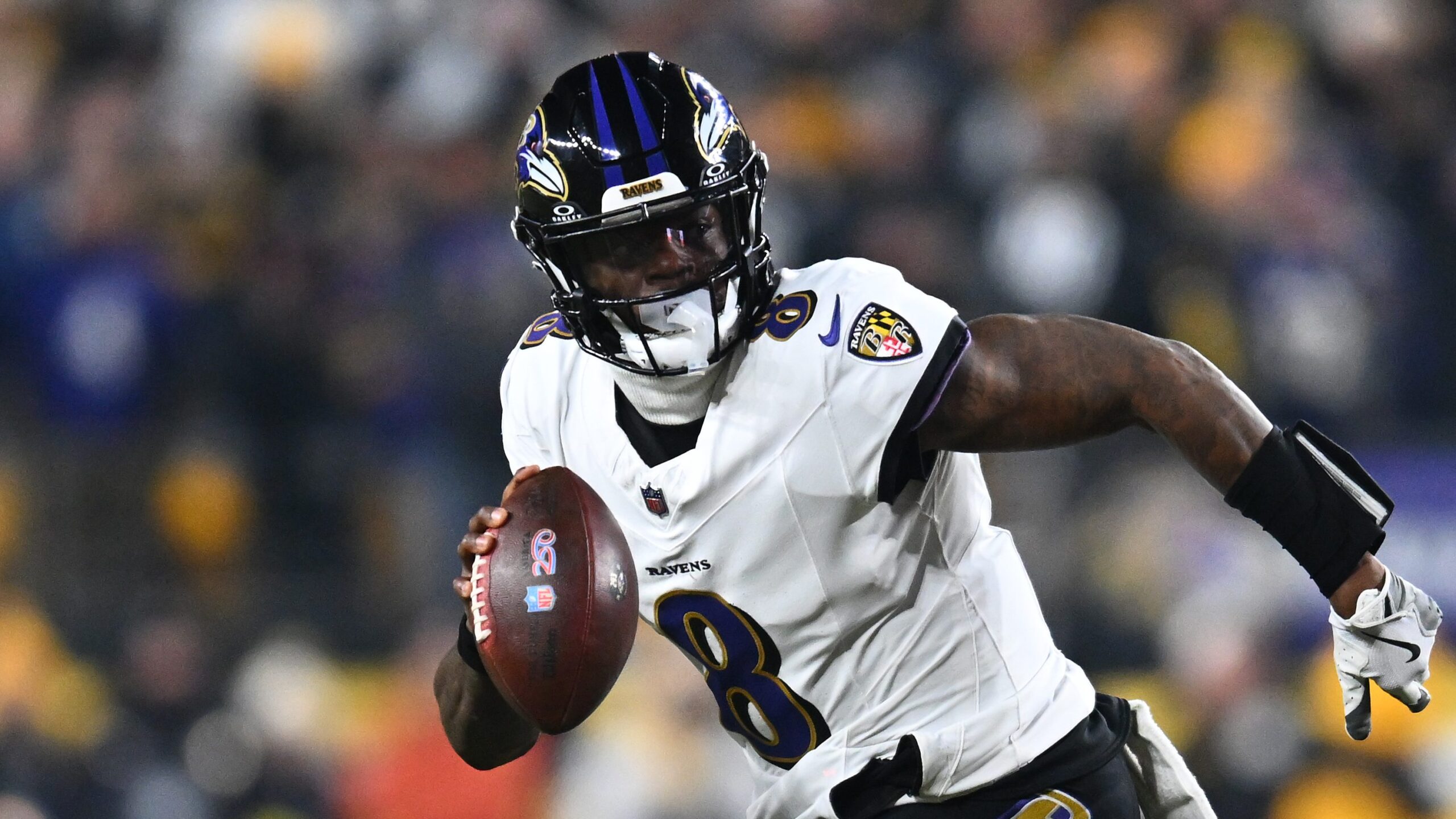 Lamar Jackson sprints against teh Pittsburgh Steelers in a January 4 game.