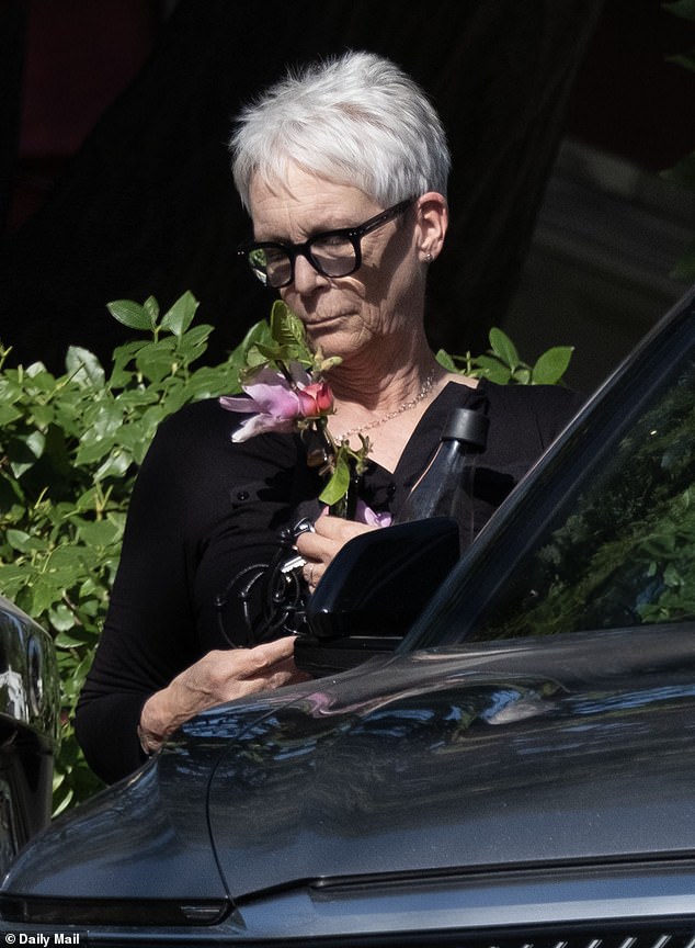 The Halloween star, 67, and Guest — who share daughters Annie, 39, and 29-year-old Ruby — appeared downcast as they got out of their car and stopped to admire a flower.