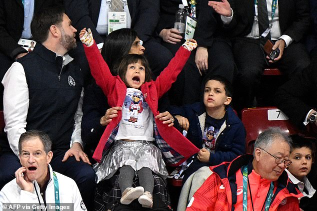 In adorable pictures of the family sitting in the stands, Mirabel, who switched between perching on both of her parents’ laps, was seen excitedly cheering for the US figure skaters.