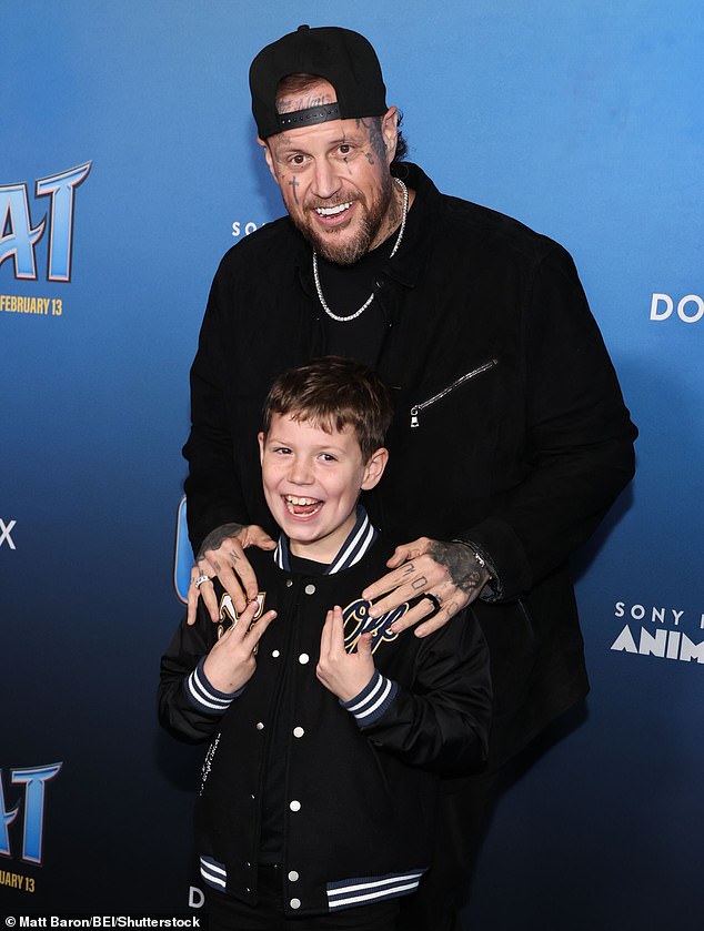 Jelly Roll and Noah were dressed alike in dark clothing, with the slimmed down Son of a Sinner draped in his signature black duds and reverse baseball cap and his boy clad in a stylish button-down jacket with white and blue stripes at collar and cuffs.
