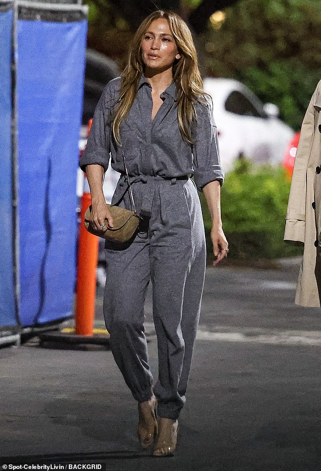 The singer was stylish in a light gray jumpsuit that was secured with a belt that tied around her waist