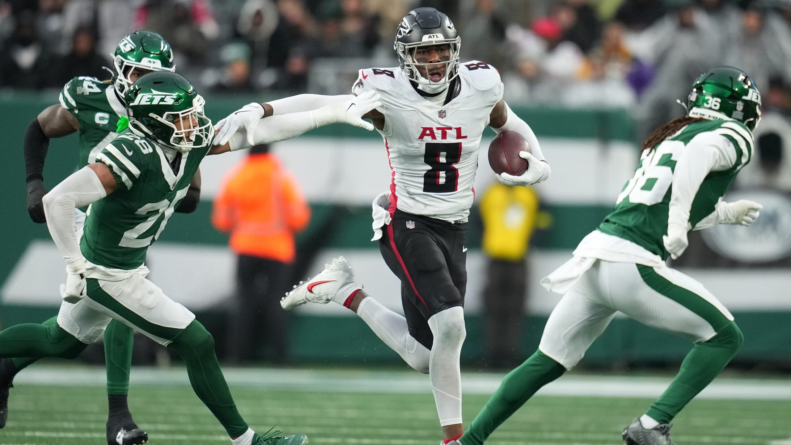 Atlanta Falcons tight end Kyle Pitts making a play during an NFL game against the New York Jets.
