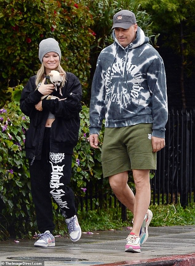 The Winning Time actress wore black sweatpants with and oversized black jacket and grey crop top. She wore a grey beanie over her blonde hair and carried Manganiello’s beloved Chihuahua Bubbles