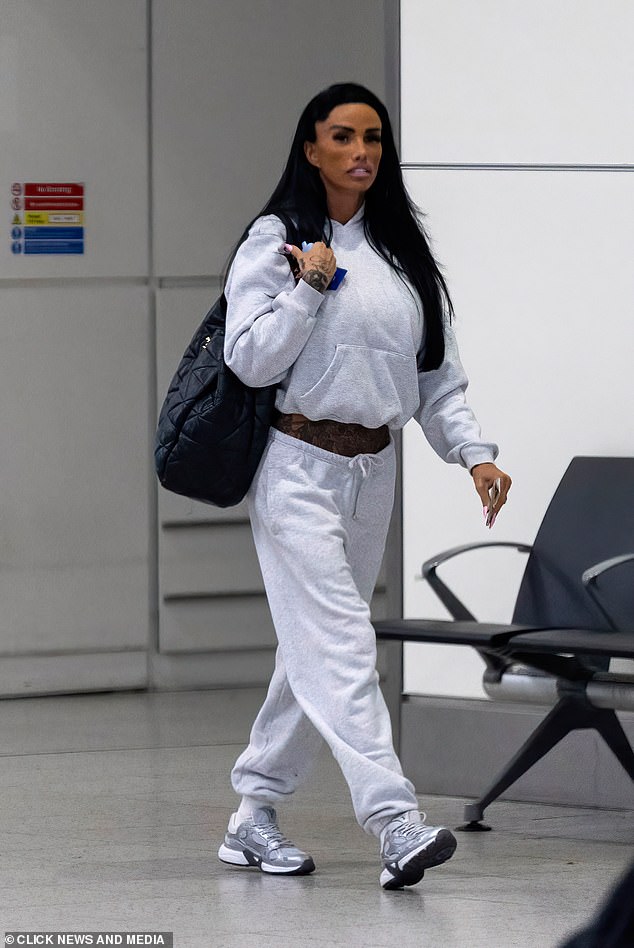 Katie Price, 47, was seen at the airport on Friday as she prepared to fly out to Dubai for her honeymoon with husband Lee Andrews