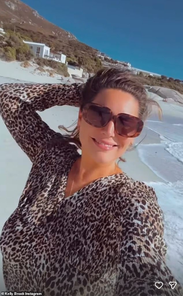Kelly Brook was making the most of her time in Cape Town this weekend as she enjoyed a boozy dance at a lunch spot before strolling along a picturesque beach