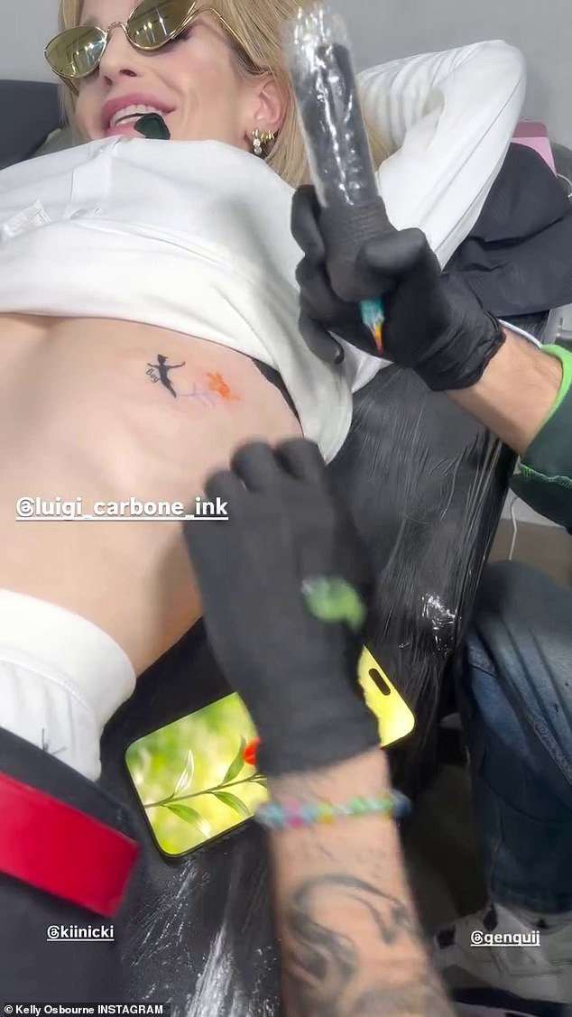 The video shows a smiling Kelly, 41, lying on her back with her shirt lifted up to expose her ribs where Luigi inked an orange lily next to a Peter Pan design with the word ‘boy’.