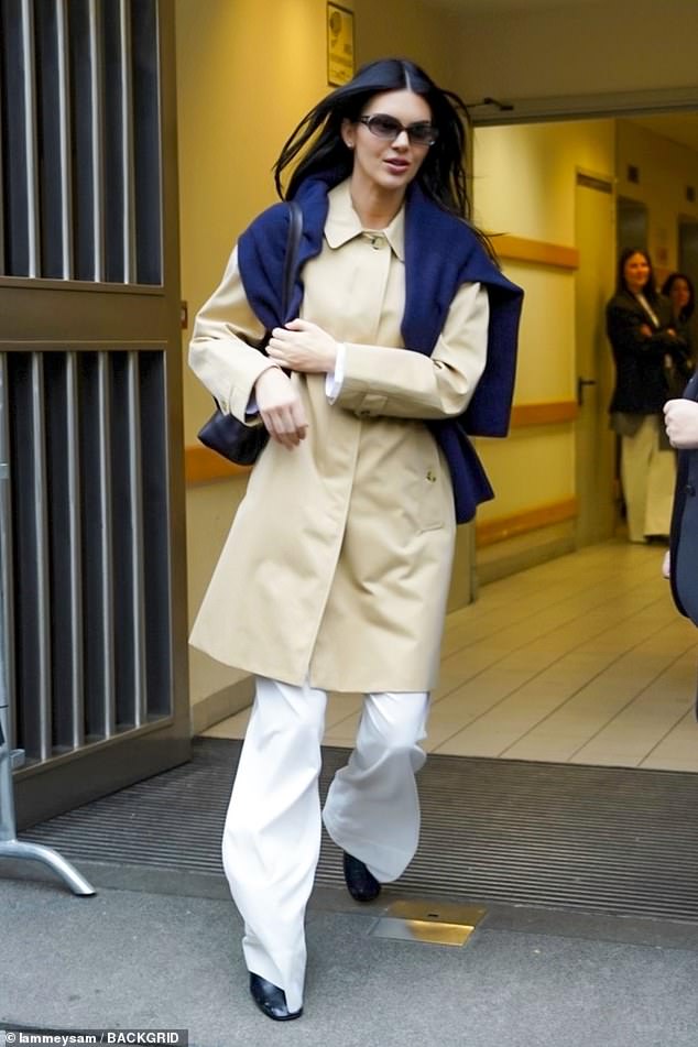 Model Kendall, 30, donned a trendy ensemble as she sported a knee-length beige jacket along with wide-legged white trousers.