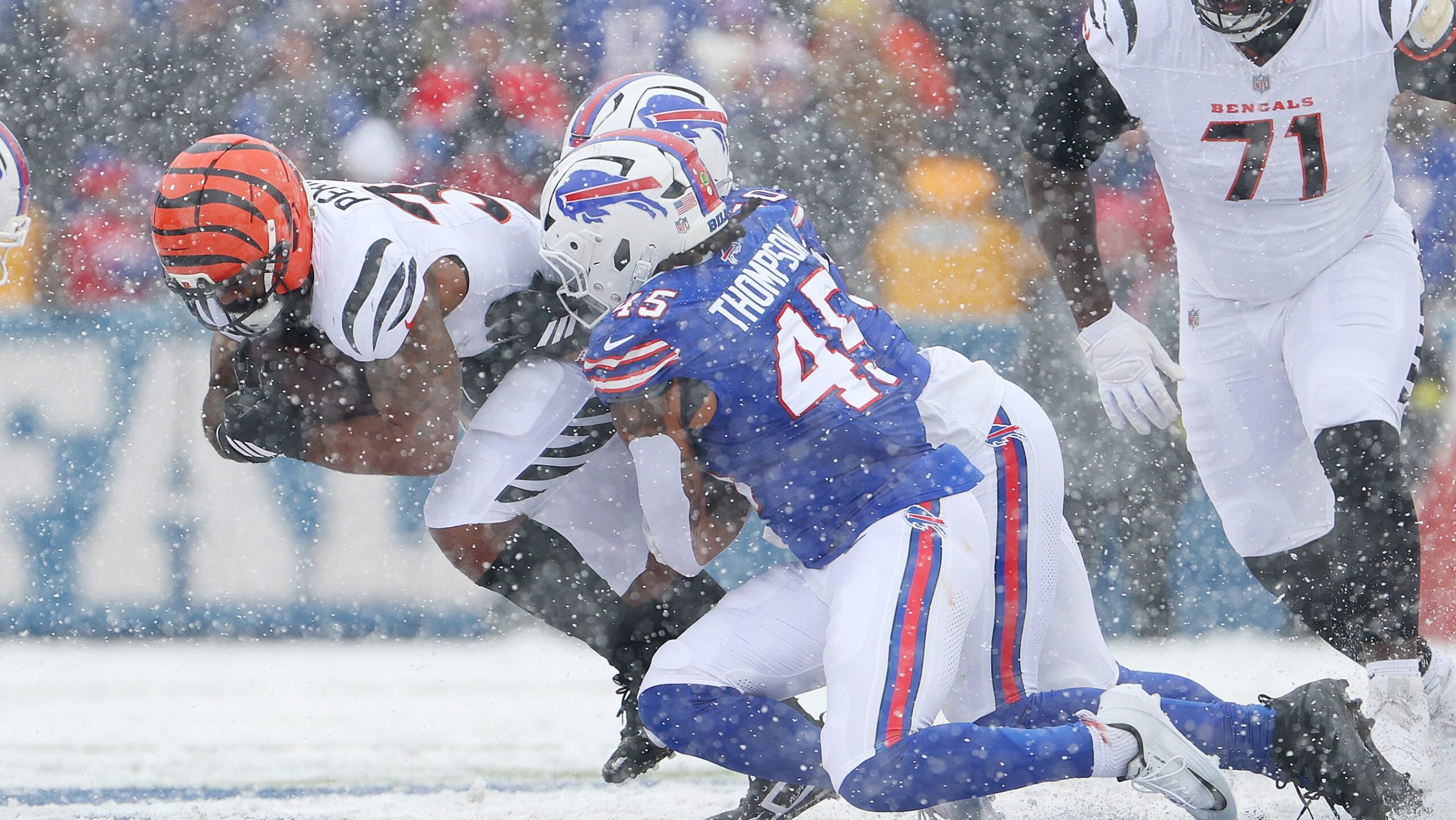 ORCHARD PARK, NEW YORK – DECEMBER 07: Samaje Perine #34 of the Cincinnati Bengals is tackled by Shaq Thompson #45 of the Buffalo Bills during the second quarter at Highmark Stadium on December 07, 2025 in Orchard Park, New York. (Photo by Timothy T Ludwig/Getty Images)
