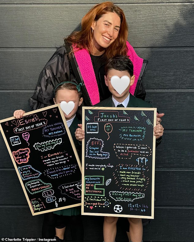 She posted pictures of their daughter and son in their uniforms, each holding a blackboard which read: ‘It’s my first day of a NEW school.’