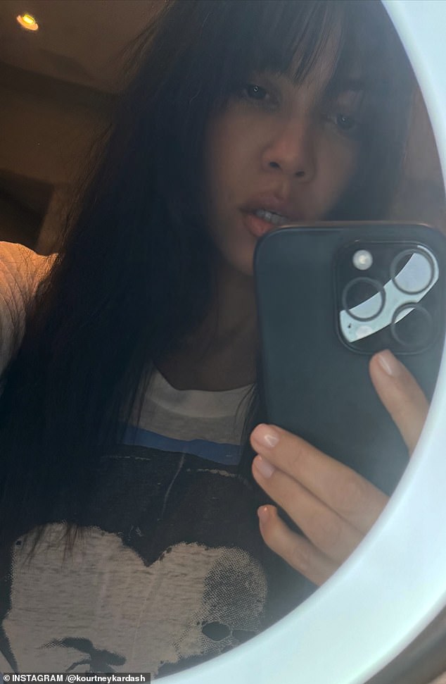 Kourtney appeared to go makeup-free in the pair of snapshots, which were taken in front of a ring light-framed mirror.