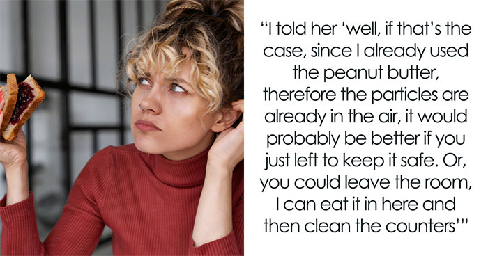 As she was almost done eating, the woman sprang up into the kitchen and demanded that she stop at once. OP was taken aback and asked why, so the stranger replied that she was seriously allergic to peanut butter. Well, the poster told her that the particles were already in the air, so she could either leave or wait in the other room until she cleaned up the counter.