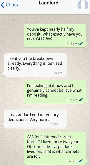 ‘I’m looking at it now and I genuinely cannot believe what I’m reading,’ the tenant said, to which the landlord replied: ‘It is standard end of tenancy deductions. Very normal.’