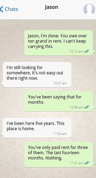 The fed-up property owner sent a blunt text message to his tenant Jason, saying he couldn’t put up with him living rent-free any longer.