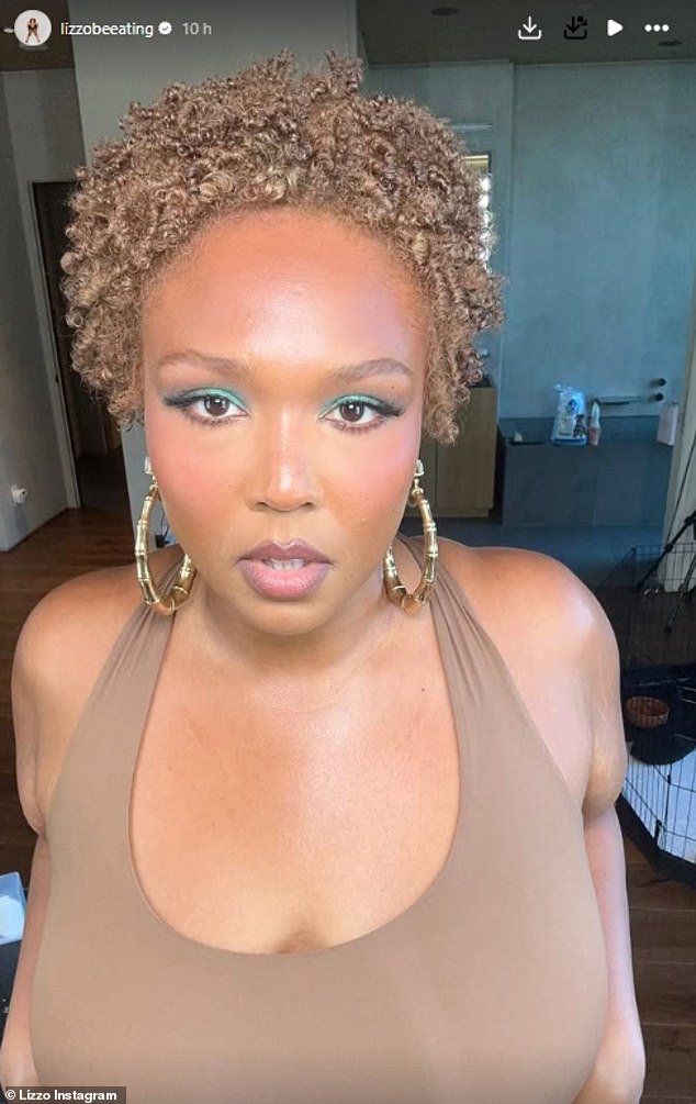 Lizzo cut to her new look where she sported a glowy full face of make-up with metallic green eyeshadow and chunky gold hoop earrings – as well as her shorter, curlier hairdo – as she cuddled her dog