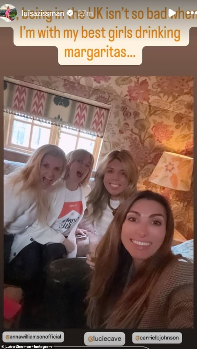 The Apprentice star, 38, declared ‘being in the UK isn’t so bad’ as she caught up with best friend Anna Williamson, Boris Johnson’s wife Carrie, 37, and Lucie Cave.