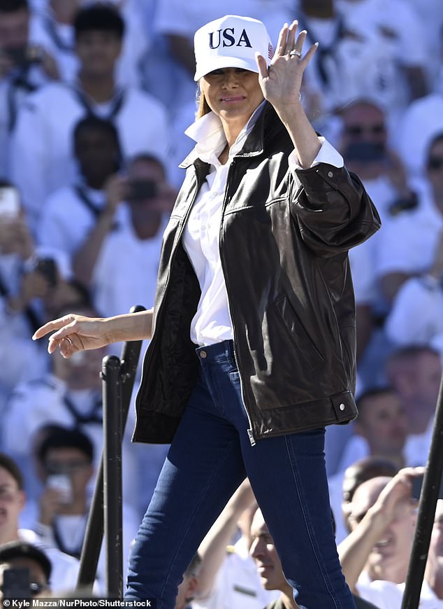 First Lady Melania Trump cut a casual-cool figure as she joined her husband in Virginia for the celebration of the U.S. Navy’s 250th birthday on Sunday – as she issued a rallying cry to the crowd.