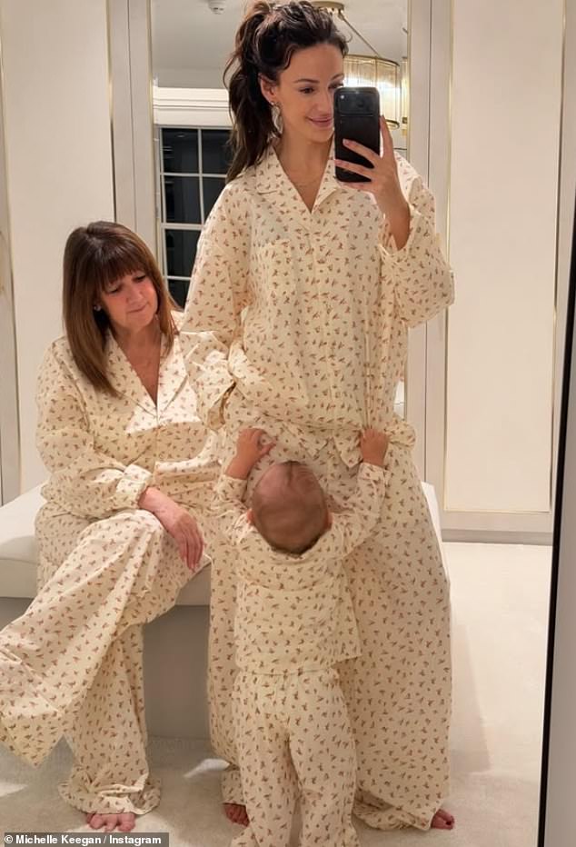 The mother daughter duo posed in matching flower patterned pyjamas as Michelle wore a ‘Palma’ necklace