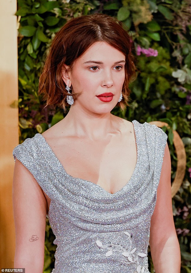 Speaking about the change, Millie said on the red carpet: ‘I feel like old Hollywood tonight. I just cut my hair into a very short bob, so I was like, “Okay, the sparklier, the better”.’