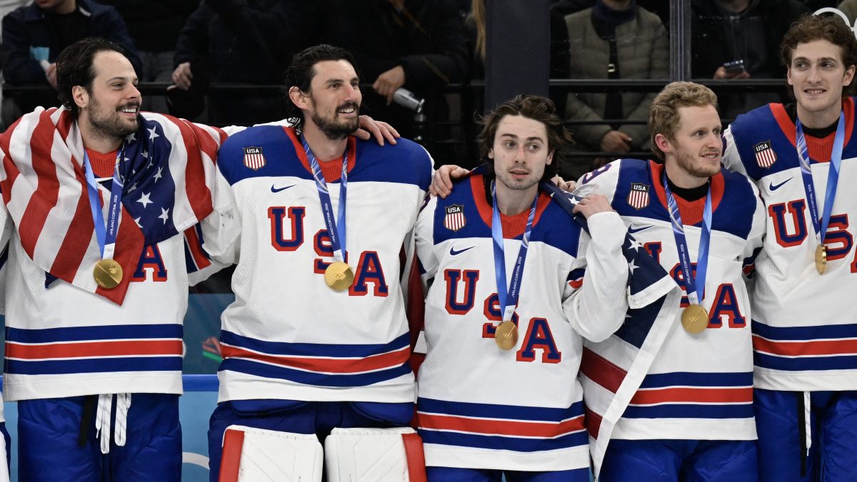 MILAN, ITALY – FEBRUARY 22: (L-R) Vincent Trocheck #16, Matthew Tkachuk #19 and Dylan Larkin #21 of Team United States celebrate a 2-1 victory against Canada in overtime for the gold medal during the Men’s Gold Medal match between Canada and the United States on day 16 of the Milano Cortina 2026 Winter Olympic games at Milano Santagiulia Ice Hockey Arena on February 22, 2026 in Milan, Italy. (Photo by Bruce Bennett/Getty Images)