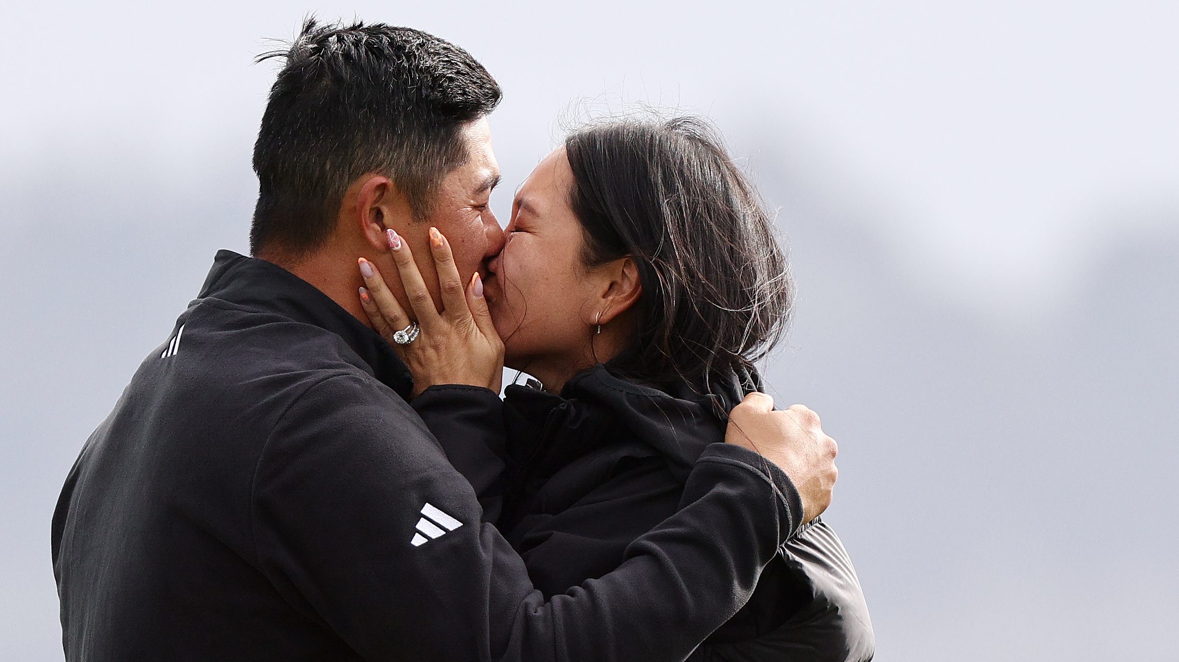PGA Tour golfer Collin Morikawa kisses his wife Katherine Zhu on the 18th green after his winning putt during the final round of the AT&T Pebble Beach Pro-Am in 2026.
